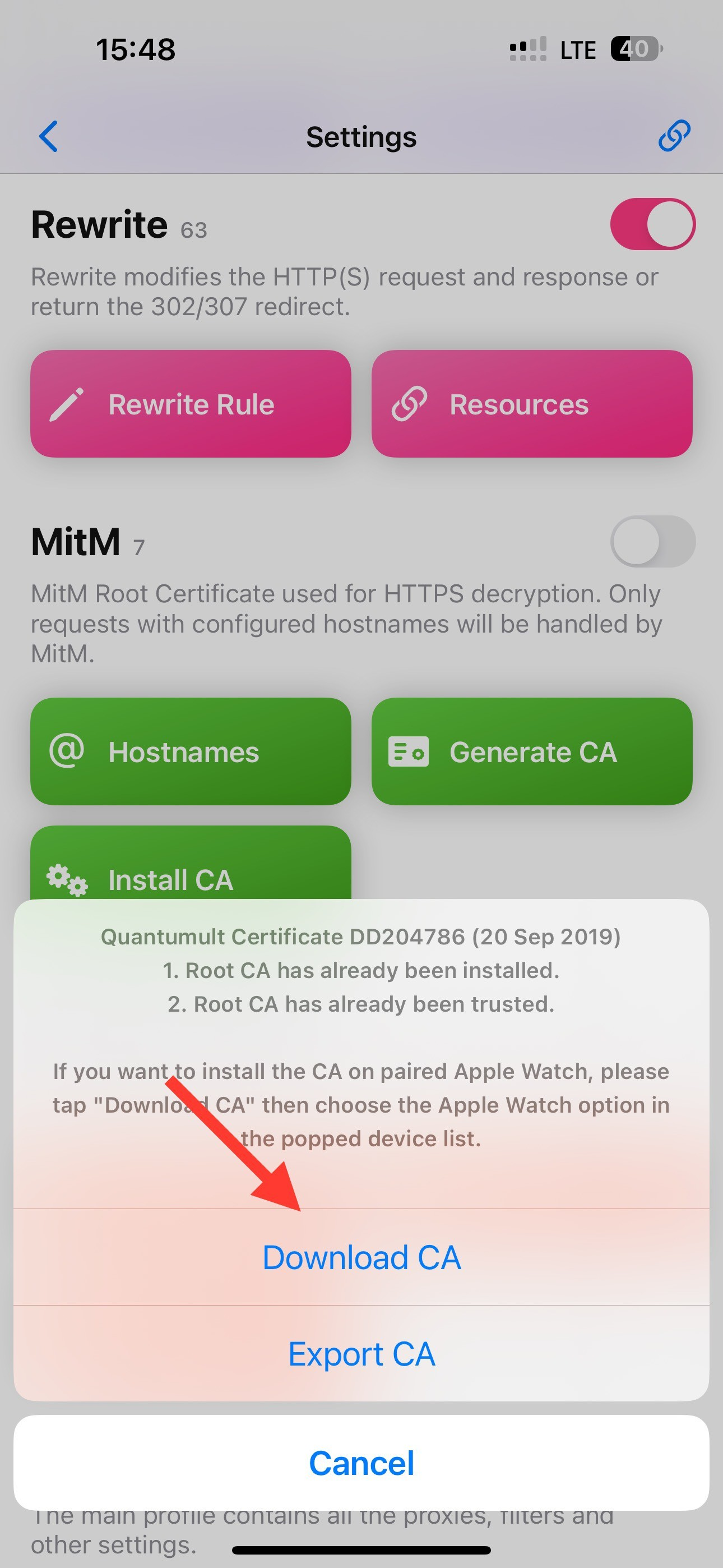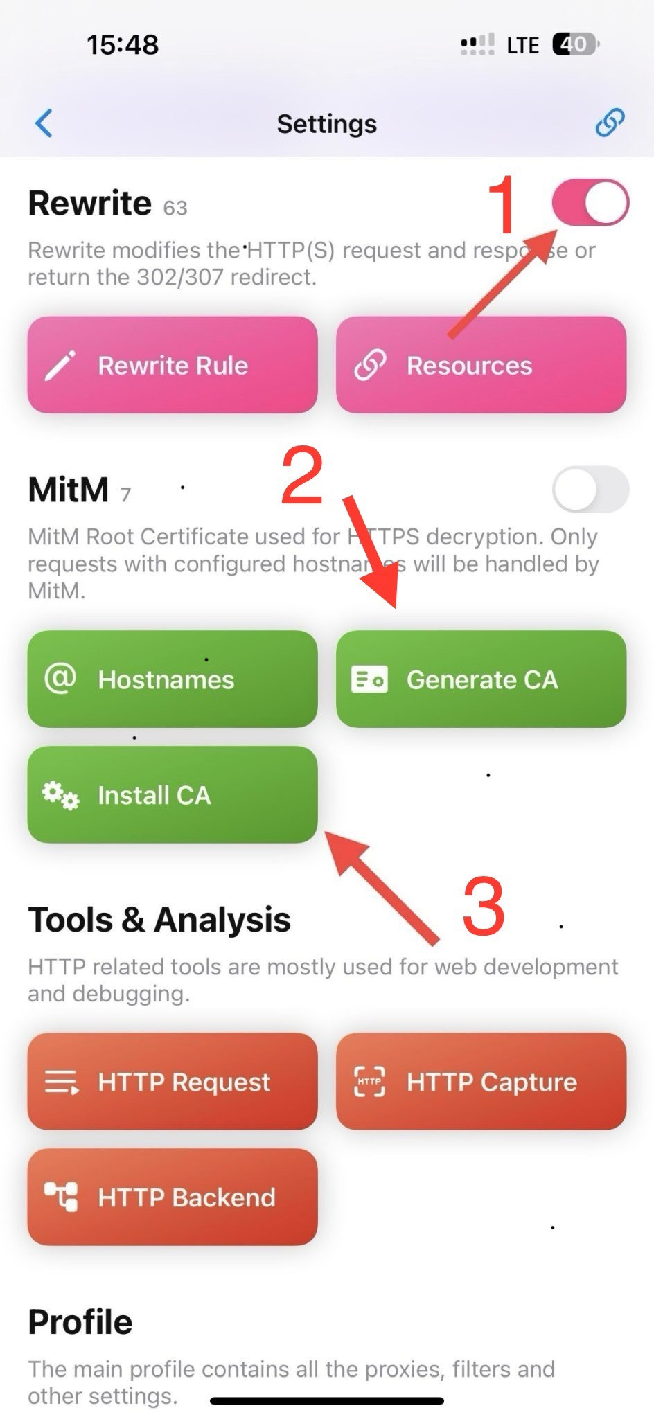 Bật Rewrite lên, chọn Generate CA và chọn Install CA tại mục MitM 🔧📝